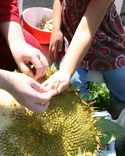 Then it turned cooler and the sunflowers drooped and it was time to take them down. Summer had ended, school had started and Buttons received some difficult news. Her teacher from last year and one she would have had this year died along with her husband in a bad car accident while attending a funeral. We told Buttons on a sunny Saturday morning, took down the sunflowers and while harvesting the seeds we discussed her teacher, death, the color of the seeds and stink bugs. This garden was bountiful and gave us the chance to get into a deep and difficult discussion while keeping our hands busy. We will plant some of the seeds next year and we will give some of the seeds away. For her teacher, Ms. M, we will plant some purple hyacinth bulbs to remember her in the spring, a time for rebirth.